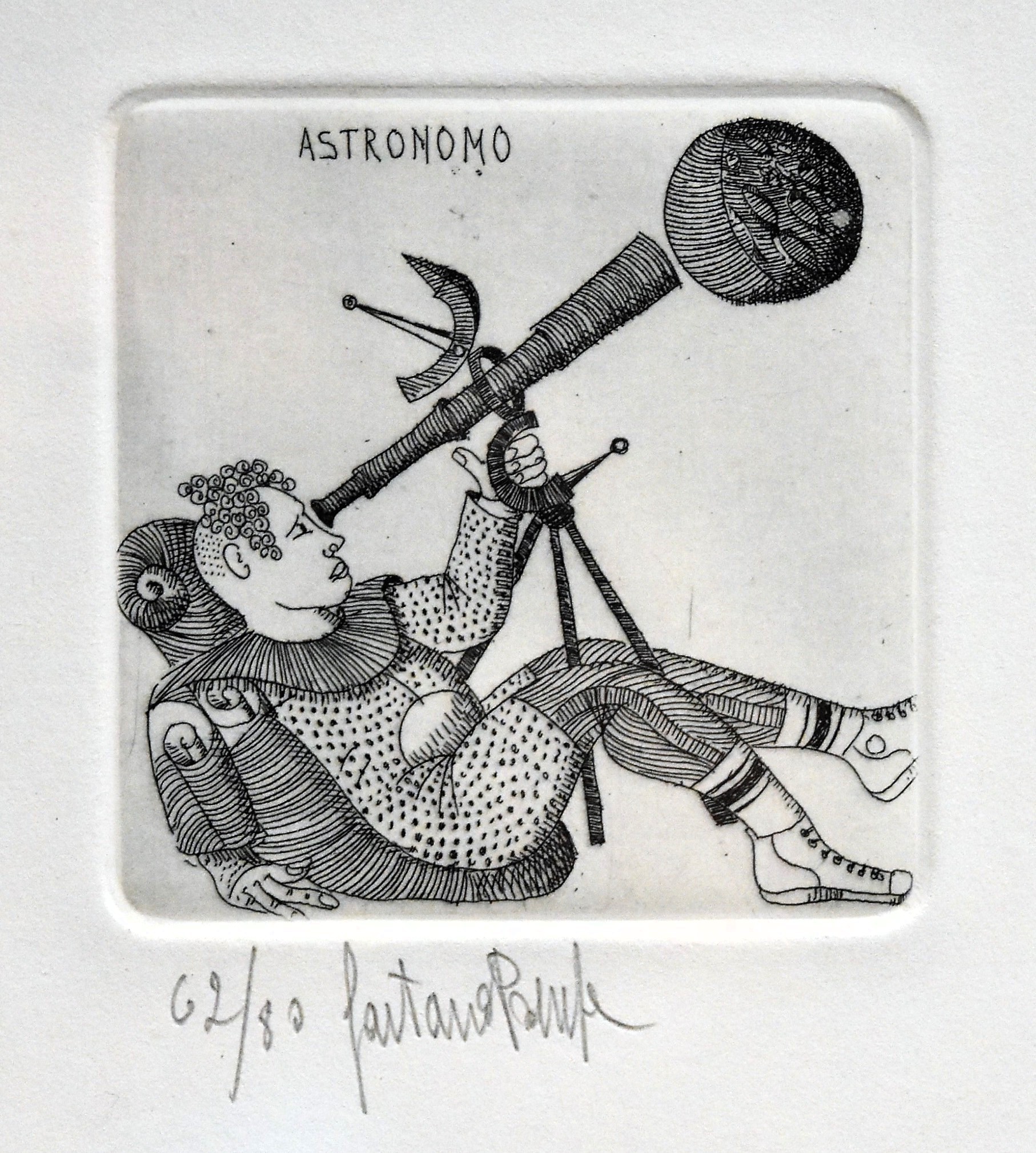 Forenza 1933 – Orbetello 1998 12 Congetture sull’attività dell’uomo, 12/12/1977 – 1 di 12 Astronomo Incisione su carta (misure foglio cm 27 x 19 – inciso mm 65 x 65) 62/80