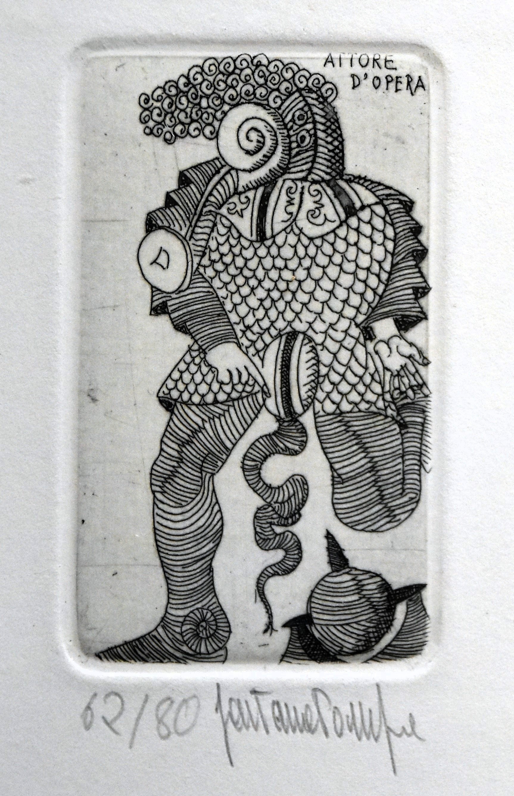 Forenza 1933 – Orbetello 1998 12 Congetture sull’attività dell’uomo, 12/12/1977 – 4 di 12 Attore d’opera Incisione su carta (misure foglio cm 27 x 19 – inciso mm 65 x 40) 62/80
