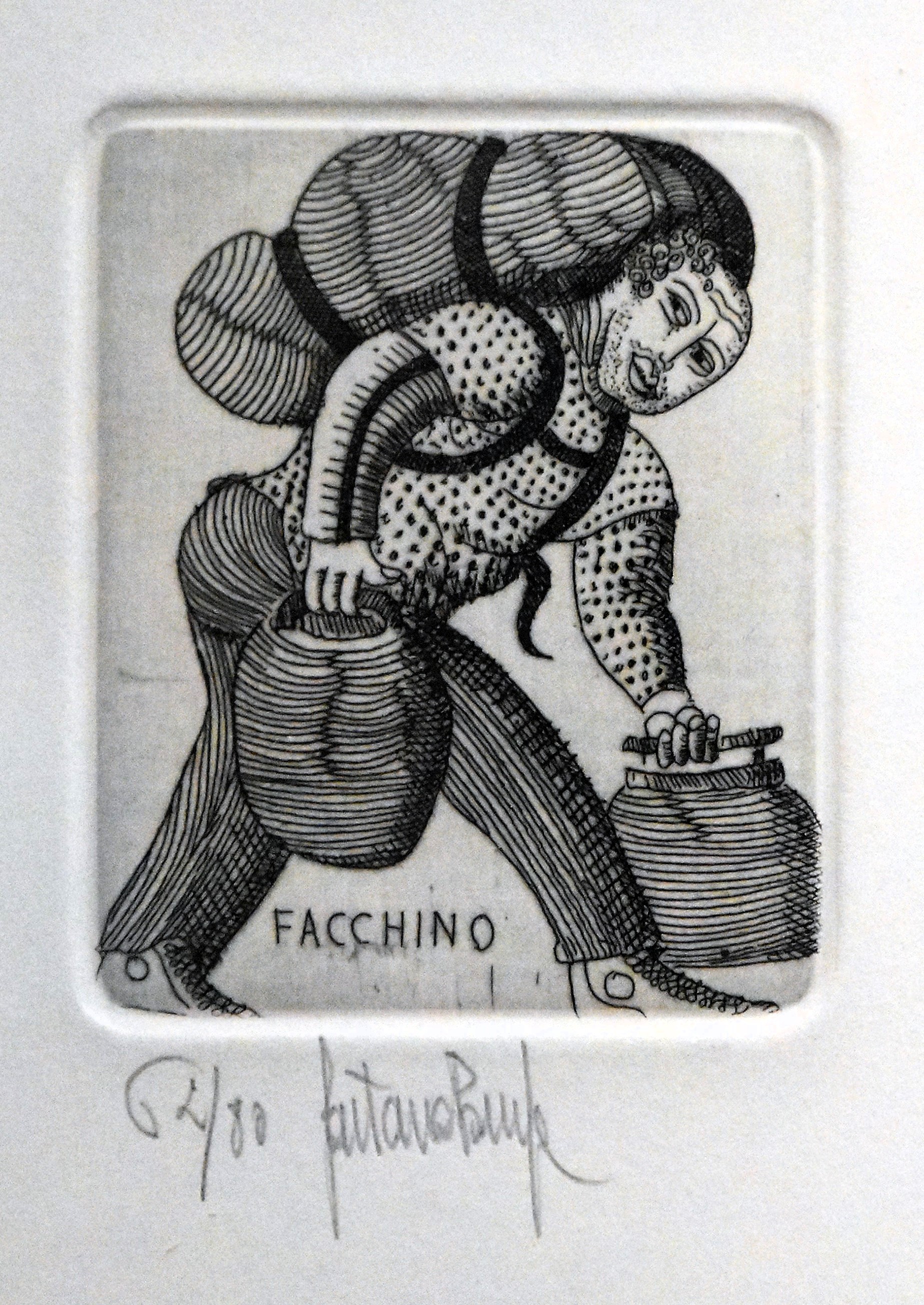 Forenza 1933 – Orbetello 1998 12 Congetture sull’attività dell’uomo, 12/12/1977 – 5 di 12 Facchino Incisione su carta (misure foglio cm 27 x 19 – inciso mm 65 x 50) 62/80